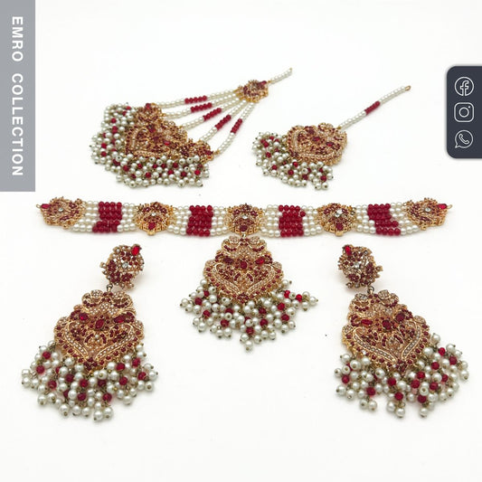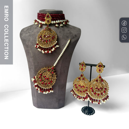 This gorgeous choker set includes a choker, matching earrings, and a maang tikka, giving you a complete and graceful look. Plus, its deep meroon shade adds a luxurious and royal touch, making it a must-have for your jewelry collection.