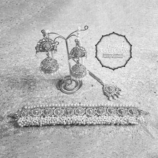 Discover the elegance of our Silver Bridal Choker Set - high end Pakistani jewelry, a masterpiece that includes a stunning choker, matching earrings, a Passa, and a tikka. Intricately crafted with exquisite silver details, this elegant set is perfect for weddings, formal events, and any occasion that demands a touch of sophistication.