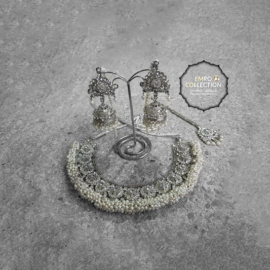 Pakistani Silver Choker Set with Earrings and Mang Tikka for Weddings